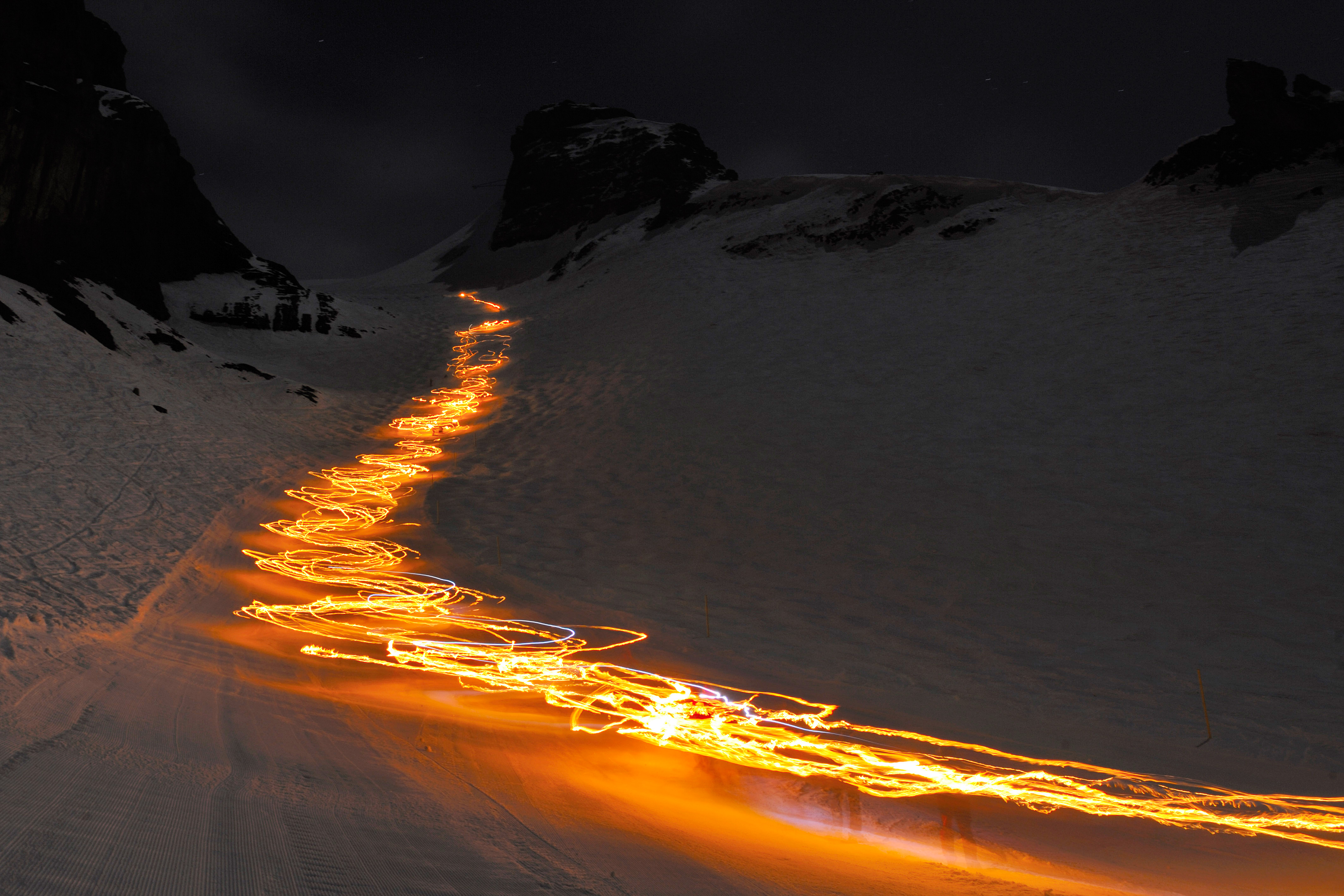 Die längste Fackelabfahrt der Welt vom Titlis-Gletscher ist 12 Kilometer lang. < >