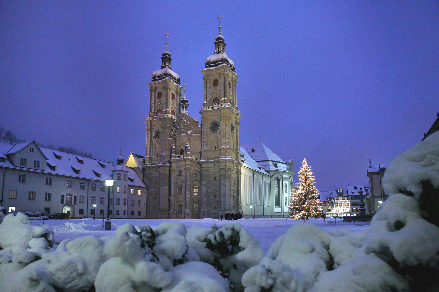 Der große Weihnachtsbaum im St.Galler Stiftsbezirk mit der Stiftskirche St. Gallen.