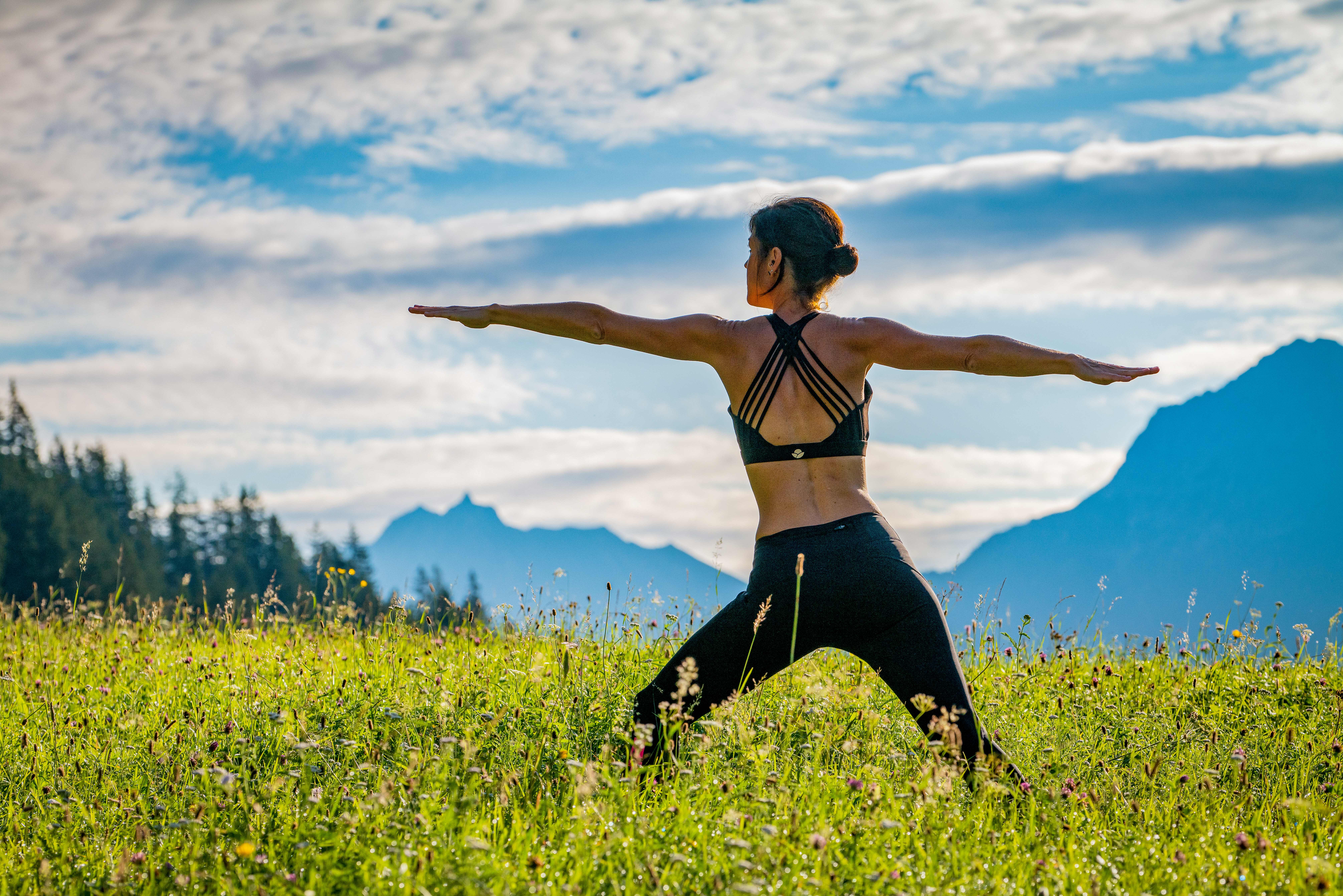 Foto: Namaste beim Lechtaler BergHERBST. Ab 24. September 2021 praktizieren Yogis morgens verschiedene Übungen und genießen dabei die herbstliche Natur des Tiroler Lechtals